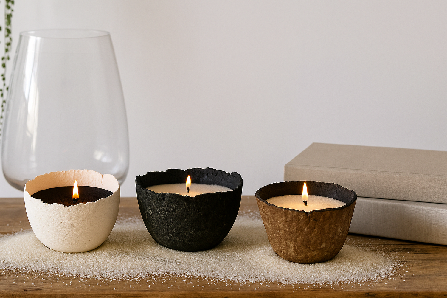 Cuencos Palmaria únicos elaborados a manos con papel reutilizable, ideal para complementar tu vela perlada Palmaria, dando un toque elegante y acogedor en cualquier rincón de tu hogar.