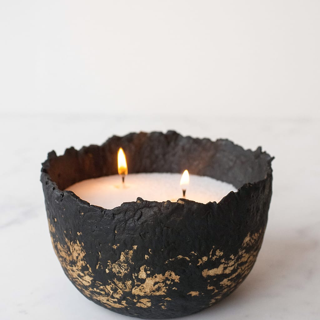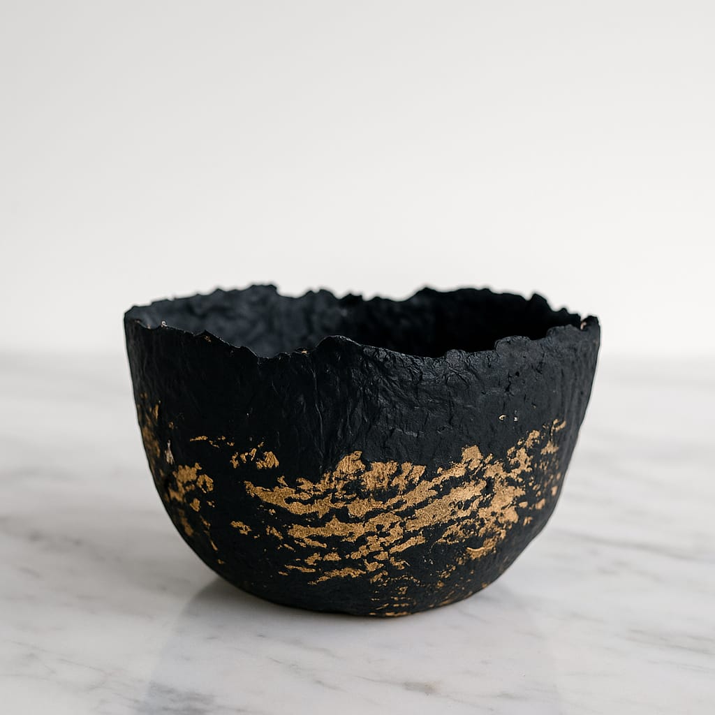 El cuenco artesanal Canis está elaborado a mano con papel reutilizable, combinando un elegante acabado negro con toques cafés que resaltan su textura natural. Su diseño de paredes gruesas le otorga solidez y presencia, convirtiéndolo en una pieza decorativa que destaca por sí sola.