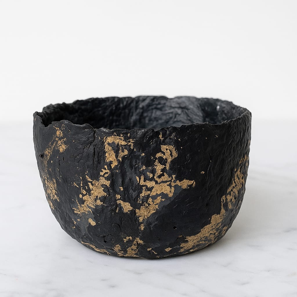 Elaborado a mano con papel reciclado, este cuenco combina un profundo tono negro con delicados toques café que realzan su textura natural y carácter artístico. Su acabado irregular y sus paredes firmes le otorgan una presencia imponente, ideal para quienes buscan una pieza decorativa con personalidad.