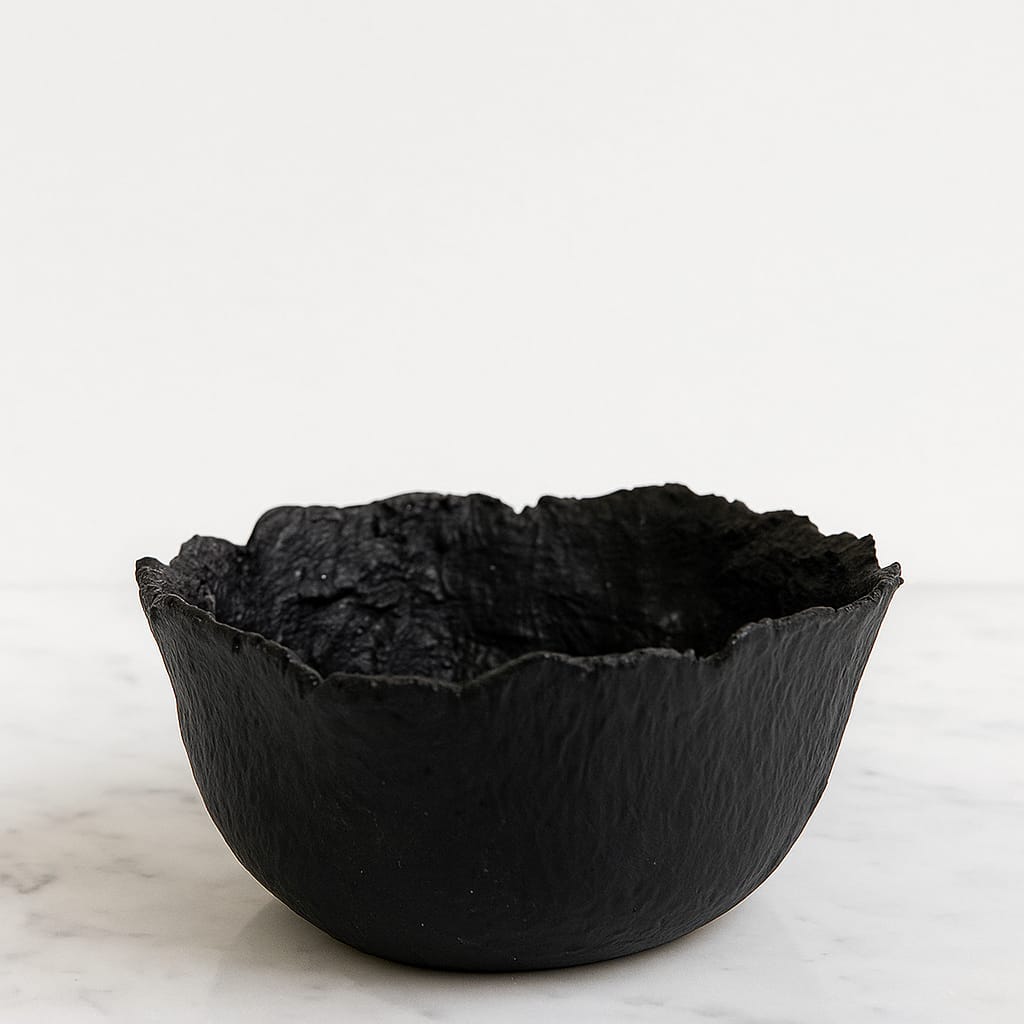 El cuenco artesanal Noir está elaborado a mano en papel reciclado con un diseño de paredes gruesas y sólida presencia. Su acabado negro mate lo convierte en una pieza de gran carácter, capaz de destacar como un elemento decorativo por sí mismo.