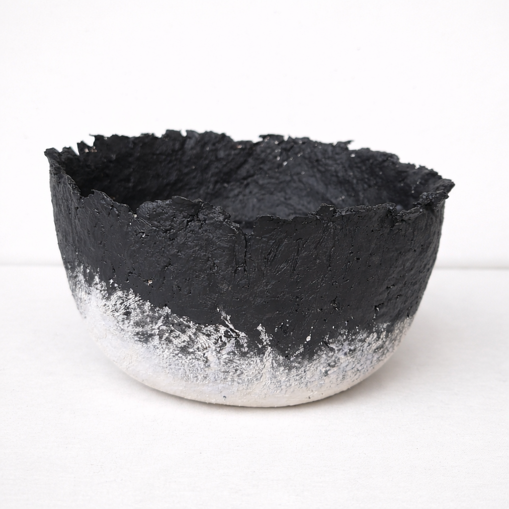 El cuenco decorativo Palmaria ZEN es una pieza que destaca por su estética sobria y sofisticada. Su diseño de líneas orgánicas y textura artesanal se combina con un elegante acabado en blanco y negro, creando un contraste sutil que aporta carácter y equilibrio visual al espacio.