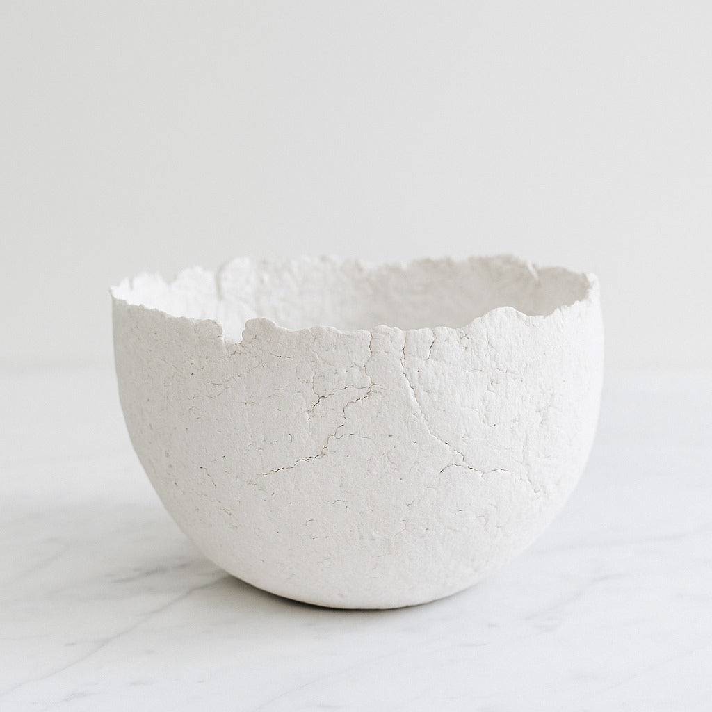 Cuenco artesanal blanco de papel reciclado, elaborado completamente a mano. Su diseño atemporal y minimalista lo convierte en un complemento versátil para cualquier espacio, aportando un aire natural y sofisticado.