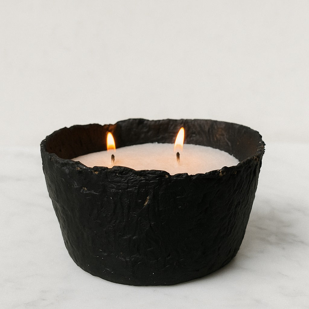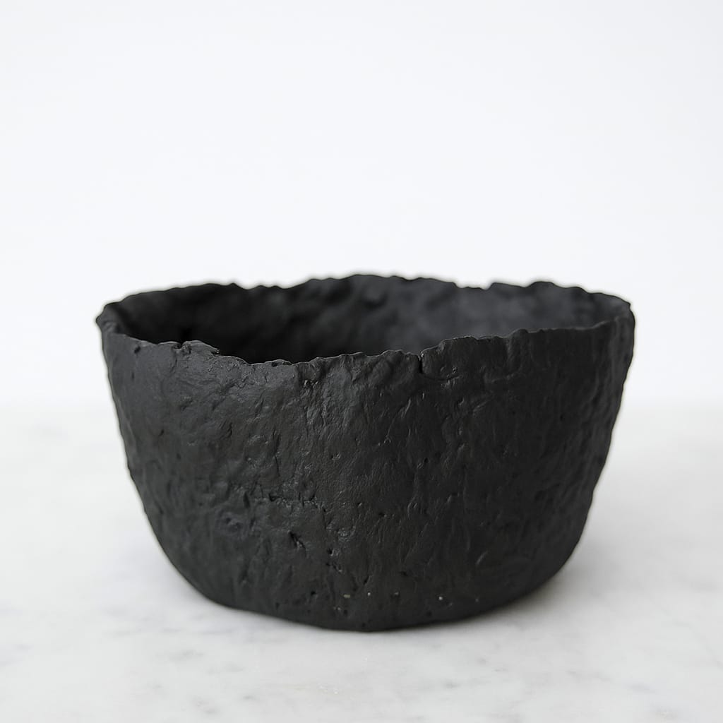 El cuenco artesanal Cenit está elaborado a mano en papel reutilizable con un diseño de paredes gruesas y sólida presencia. Su acabado negro mate lo convierte en una pieza de gran carácter, capaz de destacar como un elemento decorativo por sí mismo.