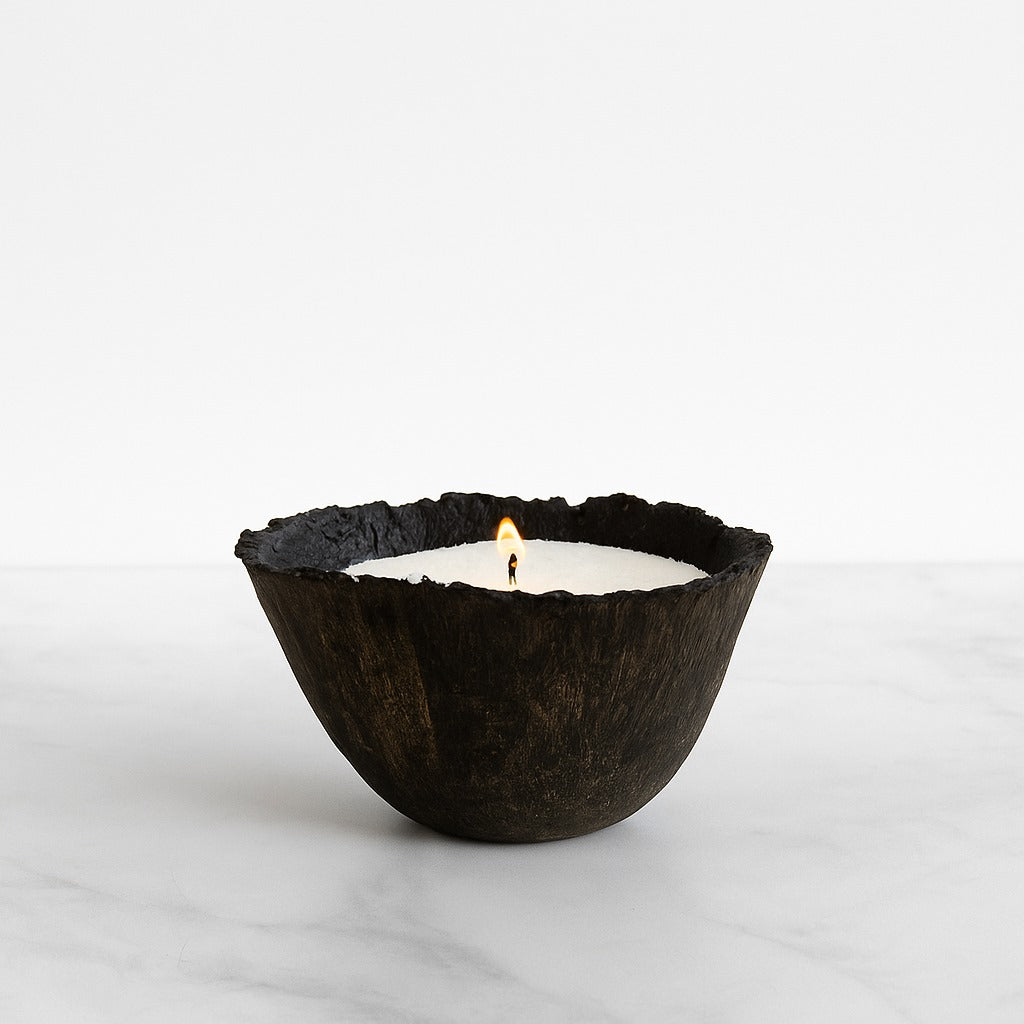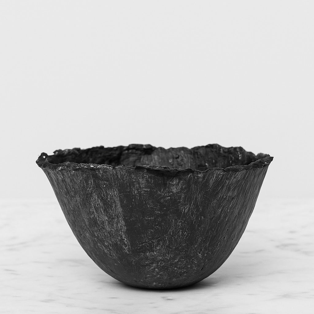 Cuenco artesanal de papel reciclado, cuidadosamente elaborado y pintado a mano. Su acabado profundo y elegante lo convierte en un objeto de alto contraste, capaz de destacar en cualquier espacio.